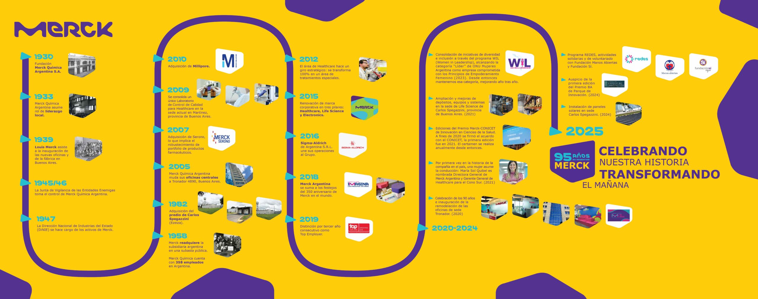 En paralelo, las adquisiciones globales reforzaron su presencia en Argentina: en 2006, la compra de la biotecnológica suiza Serono potenció la división Healthcare; en 2010, Millipore se incorporó al negocio de Life Science; en 2011, la compañía dio un giro estratégico en la Argentina para su negocio farmacéutico, enfocándose en productos biotecnológicos y tratamientos especiales; y en 2015, la adquisición de Sigma Aldrich fortaleció el negocio de Ciencias de la Vida.